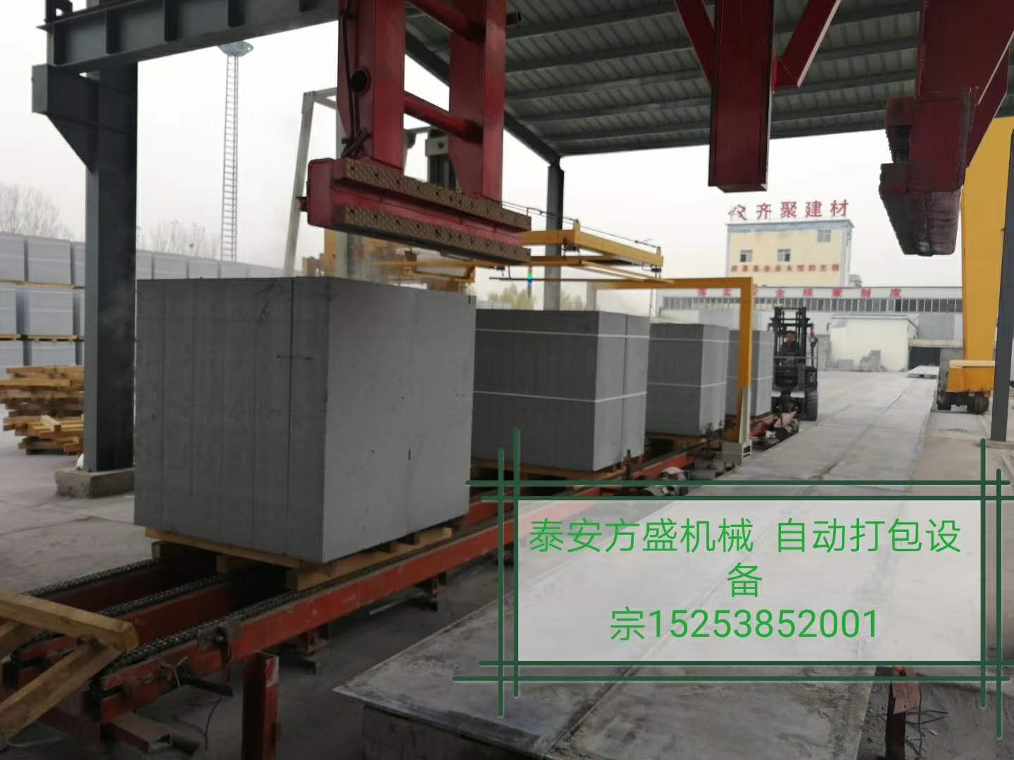 加气块打包生产线实现加气砖厂蒸养后的自动化操作,以前需要多人打包的工作,包装效率低,而且破损率也高,采用加气块打包生产线只需要一个操作,破碎率能够提高2-3%,减少了人工打包的废品率,改善产品质量,增加经济效益。